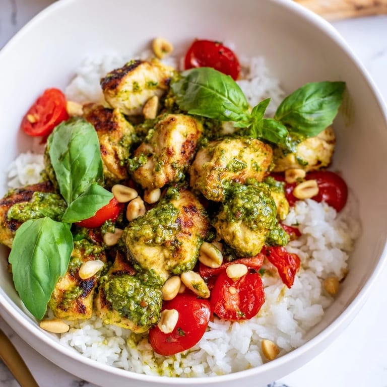 Save My neighbor handed me a jar of homemade pesto through the fence one August afternoon, insisting I try it with chicken and rice. I was skeptical at first, thinking it sounded too simple to be exciting. But that evening, standing over the stove with the smell of basil filling the kitchen, I realized how a few good ingredients could turn into something I'd crave on repeat. The tomatoes were from my windowsill, still warm from the sun, and their sweetness against the rich pesto made everything click.
