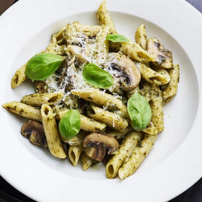 Save The smell of garlic and butter hitting a hot pan is what pulled my roommate out of her room that Tuesday night. I was standing over the stove, watching mushrooms shrink and brown, their edges crisping just enough to catch the light. She asked what I was making, and I shrugged and said something about pesto and pasta. Twenty minutes later, we were both sitting on the couch with bowls in our laps, barely talking because we were too busy eating.